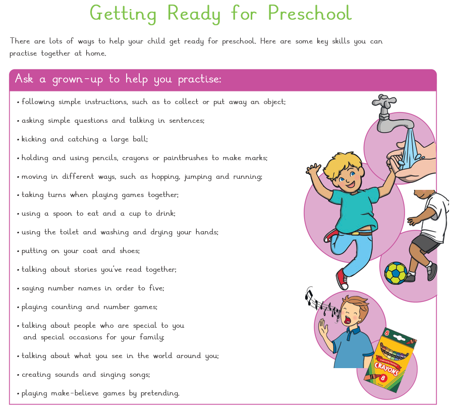 Helping your child at home, here are some things you can do to make sure your child is ready for Preschool...